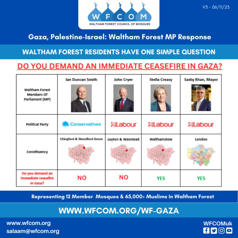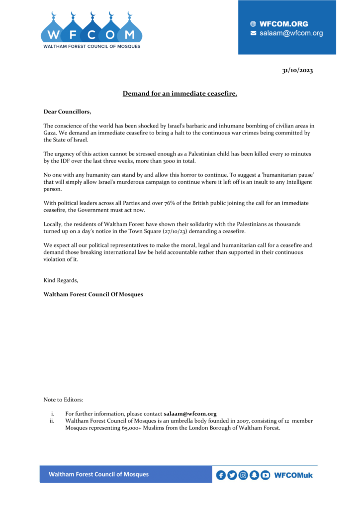 On 1st November 2023, the Waltham Forest Council of Mosques (WFCOM) addressed a letter to local councillors and MPs vehemently condemning the distressing bombing of civilian areas in Gaza by Israel. The letter highlighted the grave humanitarian crisis, noting that a Palestinian child has tragically been killed every 10 minutes over the past three weeks, totalling over 3,000 casualties.